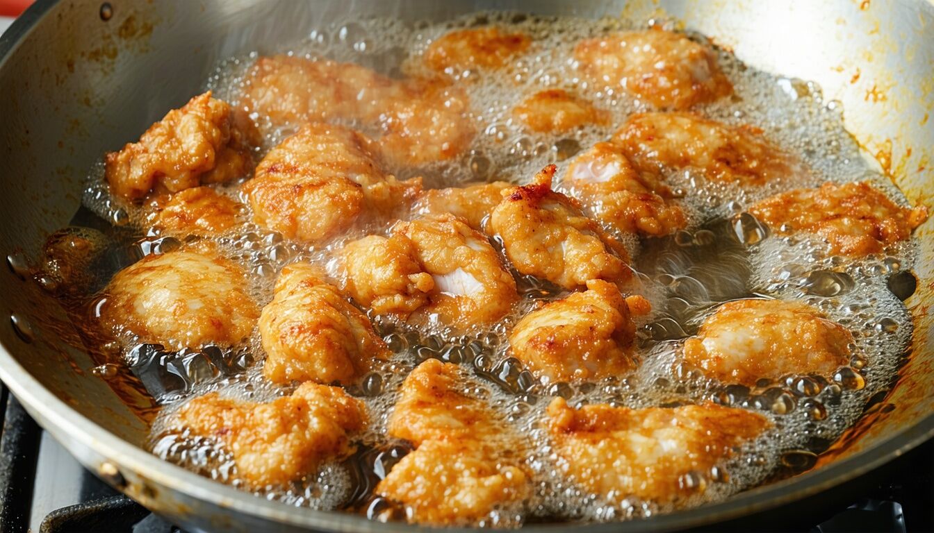 Faites frire les morceaux de poulet une seconde fois pendant environ 30 à 60 secondes, jusqu’à ce qu’ils soient bien dorés et croustillants.