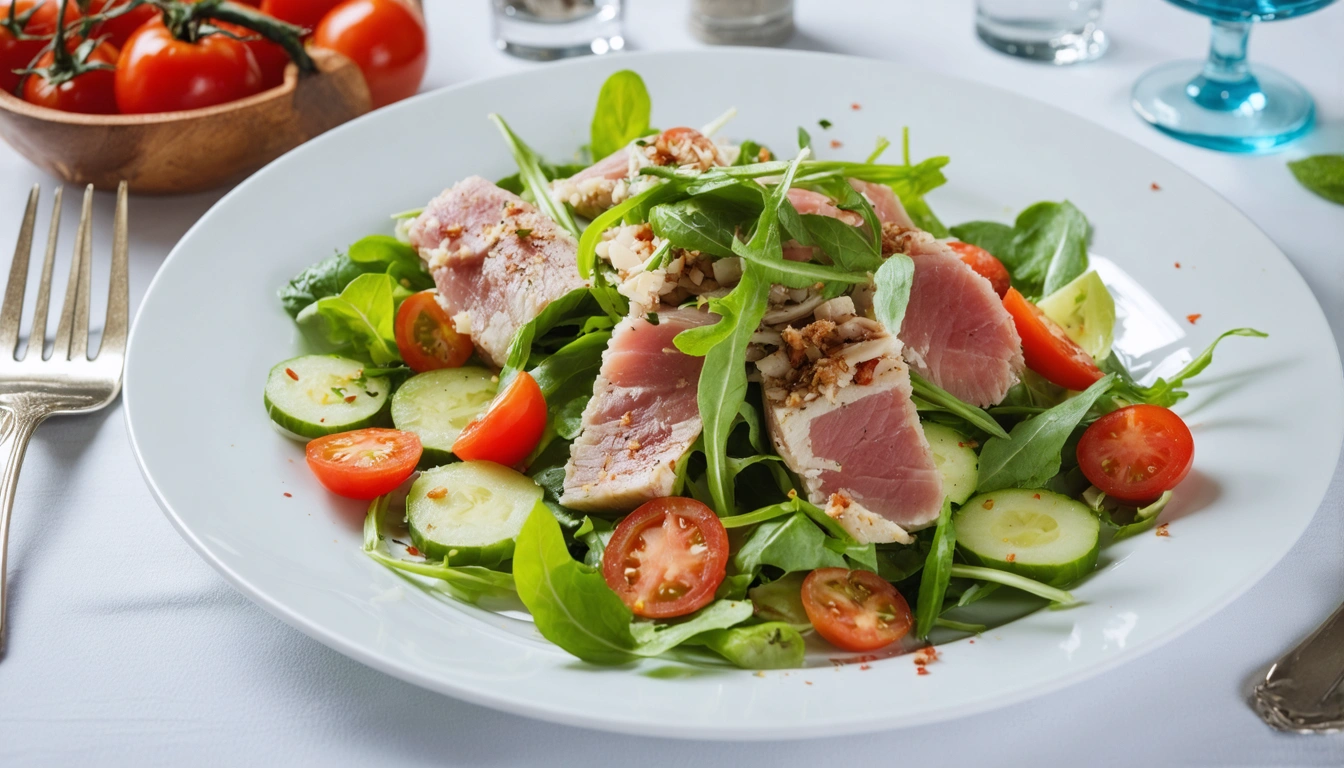 Ajoutez les finitions : Disposez le thon émietté au centre de la salade, décorez avec les quartiers d’œufs durs et les olives. Placez la salade au frais 15 à 30 minutes avant de servir, afin que les saveurs se mêlent parfaitement.